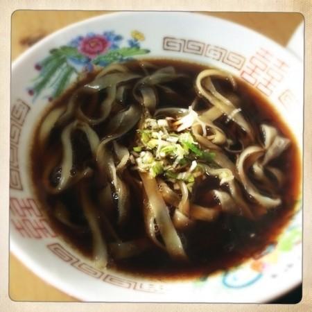 麺にたまり醤油とカツオ出汁の冷たいつゆに、太めの麺、それに薬味としてネギ、ショウガと胡麻が少々というシンプルなもの。つゆはたまり醤油とカツオのコクと風味が複雑に絡み合った何とも言えぬ深みのあるうま味と香りです。絶妙に甘味が効いてます。そこに薬味の新鮮な香り。まさに「香る露」です。見た目は真っ黒なんですが、味はそれほど濃い味つけではありません。