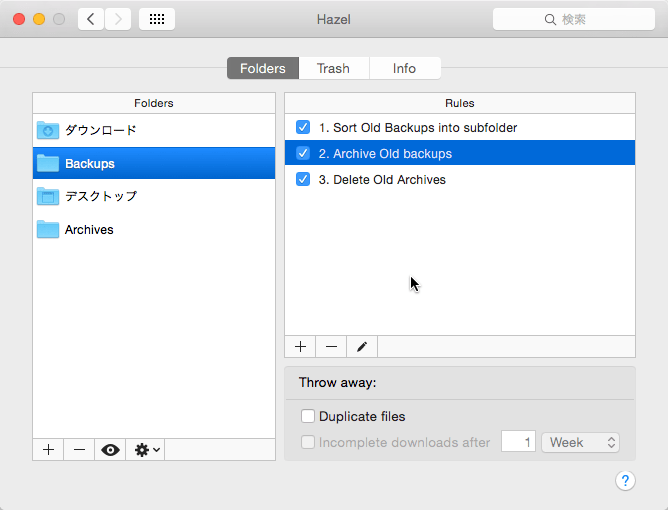 わたしの場合はHazelを使って以下のような設定をしています。