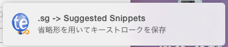 上の例は、”Suggested Snippets”という文字をスニペットで登録しているにも関わらず、自分でタイプしたケースです。通知で登録があることをTextExpanderが教えてくれるので、なかなか覚えられないスニペットも使うようになっていくでしょう。