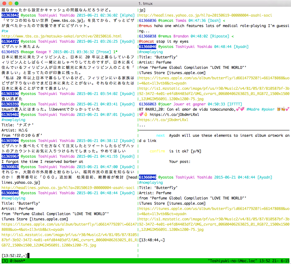 シェルを多重化して画面分割で表示し、TimelineとGlobal、自分のポスト用の枠を表示しているといい感じです。