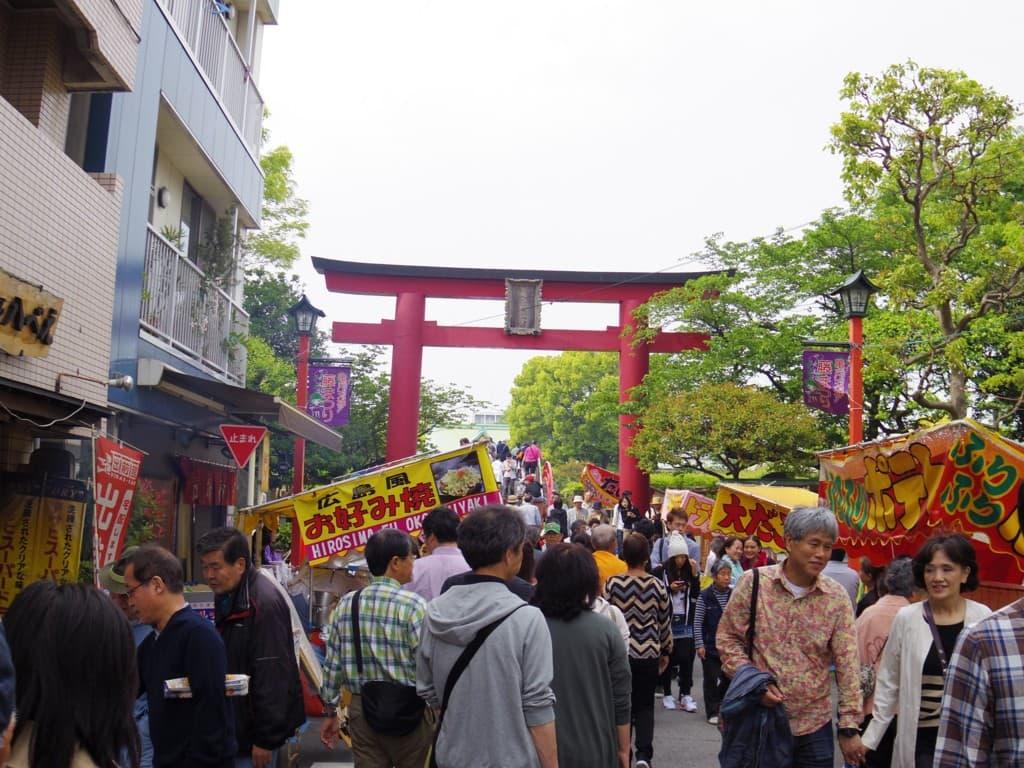 さすが、「藤まつり」をやっているだけあって、天神さまの前には露店も出てものすごい人でいっぱいです。