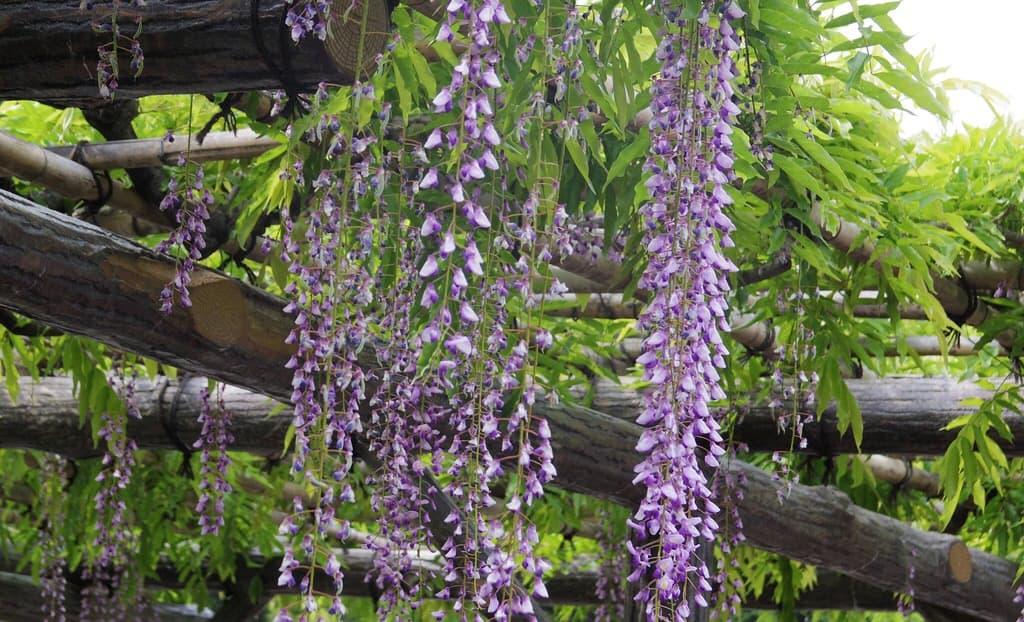 咲いているなと思っても大抵はこんな感じで、あとはもう花は散ってしまって青々と茂った藤棚を虚しく眺めるだけです。
