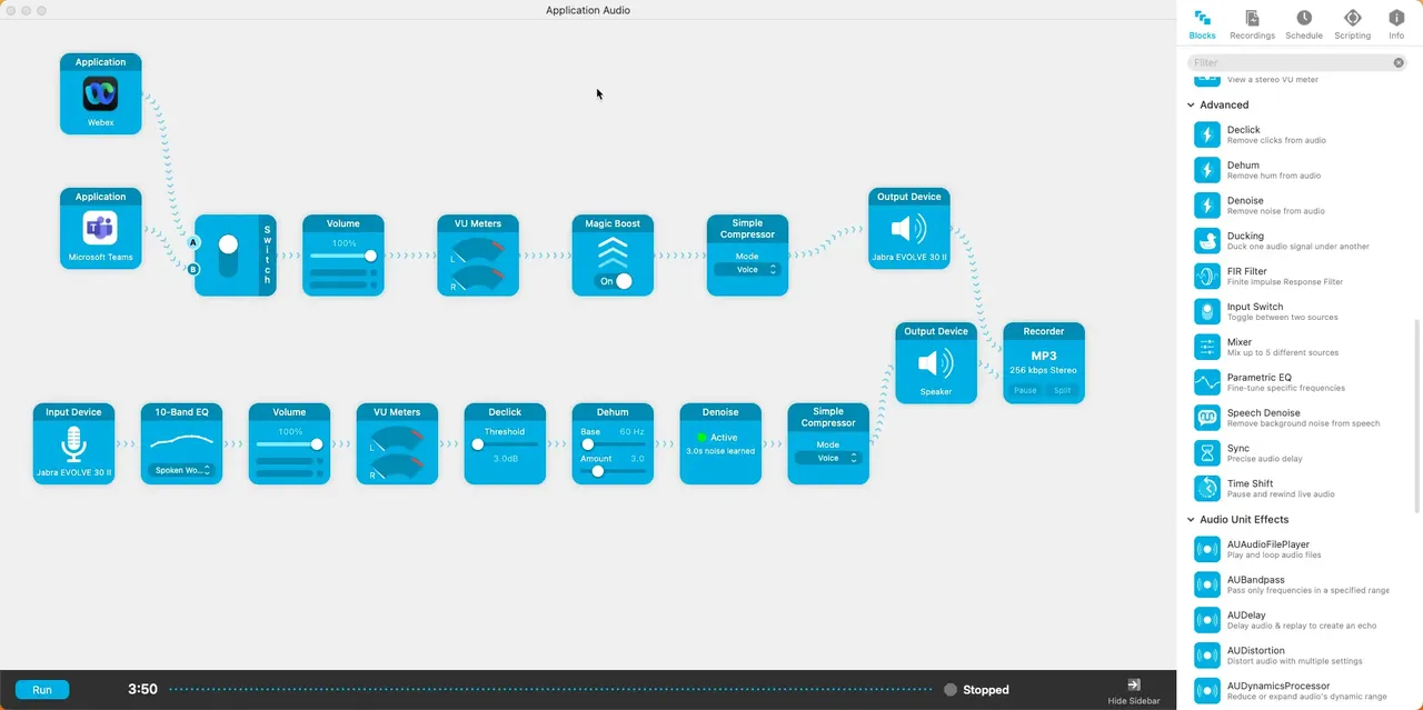 Audio Hijackは、Denoiseや Compressorといった機能 を提供しており、これにより保存する会議音声の品質を大幅に向上させることが可能で す。